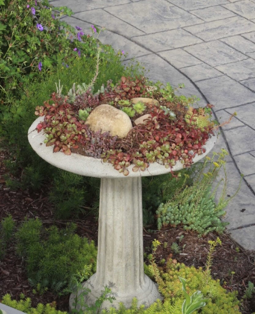 Bird baths work surprisingly well as planters, especially for succulents, for a few key reasons.